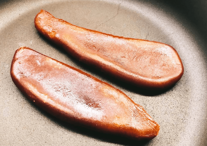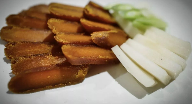 均匀压在木板上方。三五天后,卸下乌鱼籽,提起支架,提起纱布。最初的金鱼子变成了变成了亮橙色,最后干了一会儿,乌鱼子完全干了。工人们清洗鱼子酱的表面,然后将其分成两半,切断顶部的绳子,并通过家庭酿造,使其更香。用火枪将乌鱼子皮烤,最后斜切成片。这种珍贵的食物被做成这种颜色,让人想尝一尝。