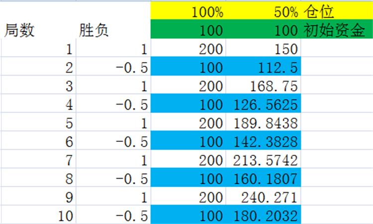 对于简单的赌局来进行推算利润最大化,其中的公式可以选择凯利投资方式,其中D为赔率,B为成功概率,Q失败概率,公式即为1-P,简单来讲,如果通过抛硬币的方式来进行选择,其实所有的条件都不做任何变动的情况下也能够出现无数次重复的情况,所以每一次在投入不同样的本金为50%的情况下依旧在不输光的本金可以实现最大的收益。但是其中需要有两个隐藏的推论需要注意,那就是每场胜率为100的时候才能值得全部进行投入,但是第二个赌局如果只有收益为正数的情况下,才能选择使用该公式进行使用,否则在投资过程当中就有可能输掉的情况。