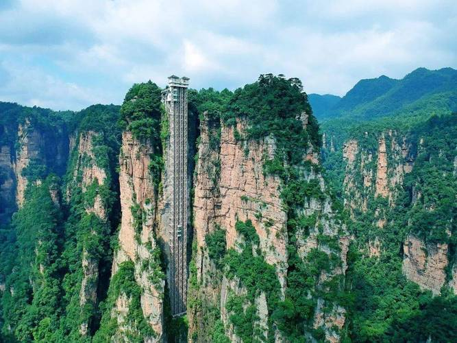 百龙电梯其实本身就可以当做是张家界的一个风景。可以把人为的景观和自然给完美的结合起来。一共有着三台观光电梯,每秒钟居然可以走5.2m,只需要66秒的时间就可以来到300多米的山顶,要知道这个山顶要是人为去爬可能需要两个小时的时间,而白龙电梯现在已经被纳入到了吉尼斯世界纪录当中。