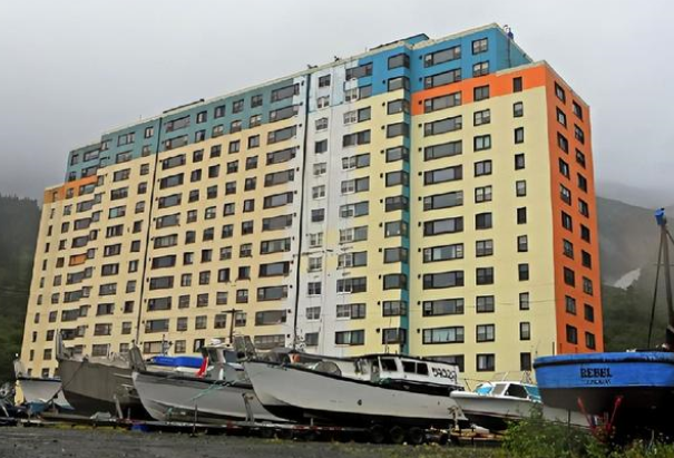 这是在美国一个并不大的小镇,人口只有300多个,不管在什么时候来到这里都很难在路上看到行人。而且在这里的人们都是居住在同一个楼上,在这个大楼里面不光有人去住,而且还有着学校,有着超市,不需要出这个楼,就可以满足自己的日常生活需求。这个建筑物其实是一个早就已经被废弃的军营,随后又发生了一次大地震,让这个小镇的很多建筑都已经被破坏,所以留下来的人都居住在了这个保存完好的建筑里面。