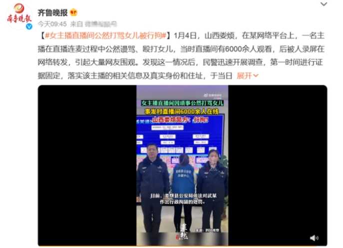 当时在直播间里看的一共有6000多人,大家刚开始还以为就是这母女两个人在一起演戏而已,可是到了后来才发现直播间里的孩子是在真的哭。女主播打孩子的时候也是在下狠手,大家也逐渐有意识到了这场直播并不是那么简单果断,选择了报警。随后也是引发了网警的关注,很快就被警方逮捕。