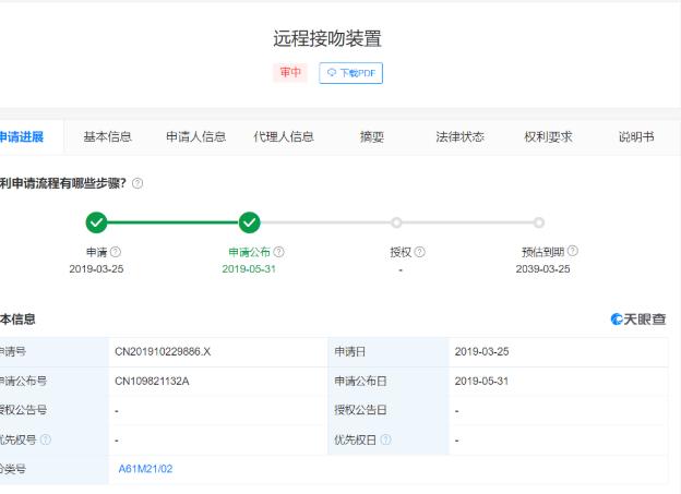 根据网友爆料在天眼查APP中已经显示有关于远程接吻专利的申请信息,在申请信息上,显示常州机电学院在2019年3月份申请了该专利,在5月份的时候向社会公布,不过,因为没有缴纳年费,该专利的使用权已被终止,现在是处于失效的状态。