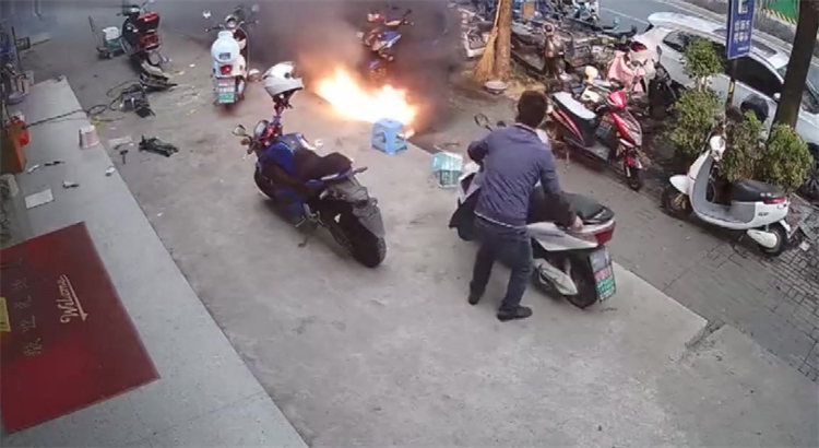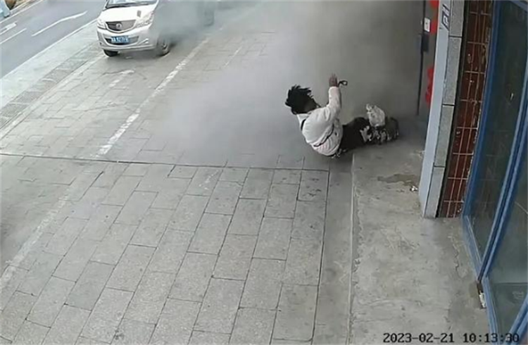 残疾男子提醒店铺冒烟 下一秒被炸飞(电瓶炸裂)