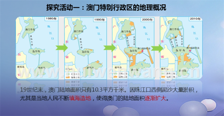 澳门特别行政区位于北纬22°11',东经113°33',在中国大陆的东南沿海部分,位于珠江三角洲地区的西岸,和香港地区隔海相望,整个区划北部的澳门半岛与广东省的珠海市连接,靠南地区则有氹仔、路氹城和路环这几座岛屿组合而成的一座大岛,这几个区域现在都属于海岛市,暂时还没有正式的名称,澳门就由上面描述的这几个部分组成。