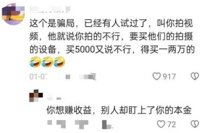 不过在有些人越浴室之后才发现自己交了一些定金,反而是被人给拉黑了,才明白这就是一个骗局,甚至于有一些人明明已经住进去了,这个凶宅,等到按照要求把视频上传上去之后,有人说不行,是因为清晰度不够,必须要买一些专业的设备,刚开始买5000的,后来又得买一两万的。到最后不光没有赚钱,反而还需要亏别人一笔钱。