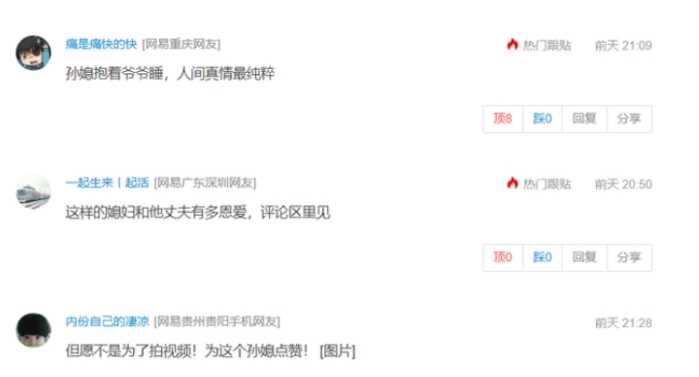 孝顺确实是我们中华民族的一个传统美德,可是孝顺的也应该有一定度,自己家里老人也是需要自己照顾才行,不过也有一些人表示这样的视频很有可能只是炒作而已,有的人为了炒作赚钱,压根没有什么底线。要不然在日常生活当中怎么可能有孙媳妇心甘情愿的去照顾爷爷。