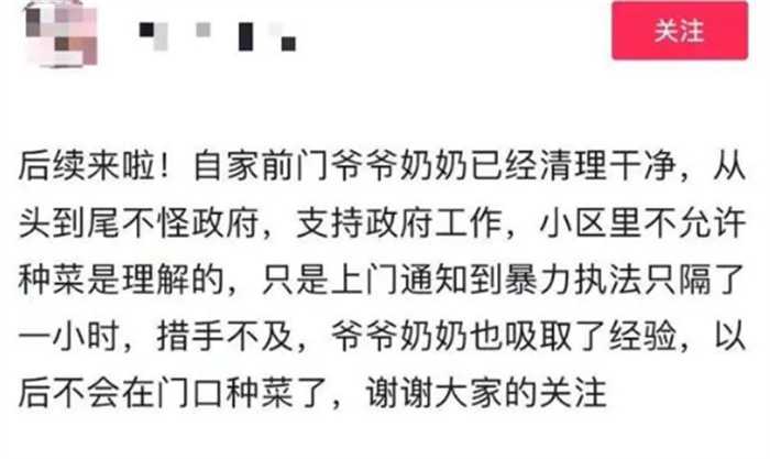 发布视频的这个人说老人今年82岁了,在自己家里闲不住。就在小区里面种了20多个小青菜,现在已经被全部清理。从通知到清楚,只用了一个小时的时间。他们认为配合政府执法工作应该是每个公民的义务,但是这样的手段太过于暴力,让他们无法接受。也有网友表示这些蔬菜摆放的很整齐,没有造成环境影响更何况是在自己家里,为什么要进行暴力的清理?
