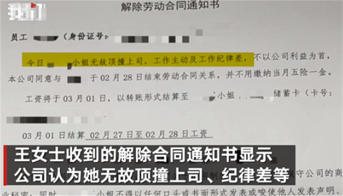 而在王女士晒出来自己关于解除劳动合同的通知上面。他被定性为顶撞上司以及工作纪律差。对于这个,王女士表示自己并没有顶撞上司,而且是在完成了工作的情况下有着稍微加班之后才离开了公司,况且也是和领导报备过。在这个视频发出来之后,网友们也是积极的进行回应,认为准点下班是应该的,领导在和下属进行沟通工作的时候,应该尊重最起码的人权,而不是高高在上。