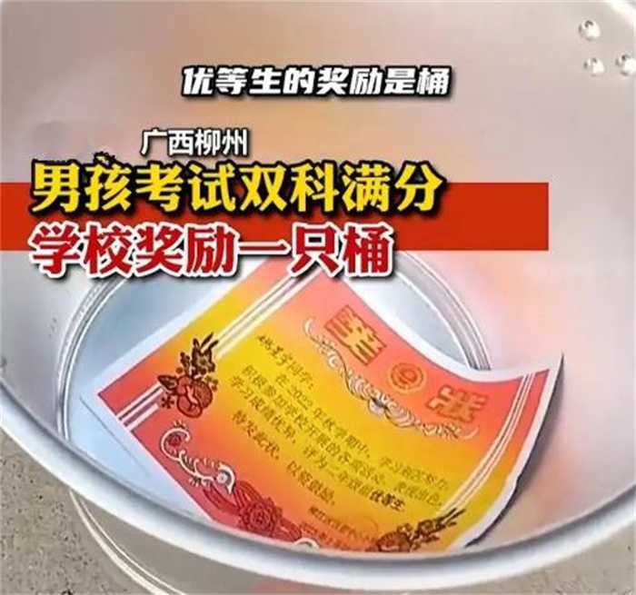 男孩子考了双百分之后奖励是一个桶意味着第一桶金。现在不少的孩子在考试好了之后,家长或者学校都会给他们一些奖励。在前段时间广西有一个男孩子抱着一只桶回了家,这是挺让人难以理解。上学的小孩儿带着一桶做什么,随后有人说这个男孩儿之所以抱着一只桶,是因为他在考试的时候,语文和数学是双满分,老师奖励了他一只桶。