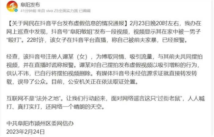 这件事情在后来被相关部门发现在进行调查的时候,发现这个女人说自己被家暴,其实都是自导自演,是为了博取网友的同情,然后吸引流量赚钱。现在这个女性已经把自己摆拍的视频给删除。公安机关对于这个案件进行依法处置,毕竟这已经属于谣言的范畴,在网络上有了一定的影响力。像这样的人应该让他背上一些法律的处罚,让他长长记性。
