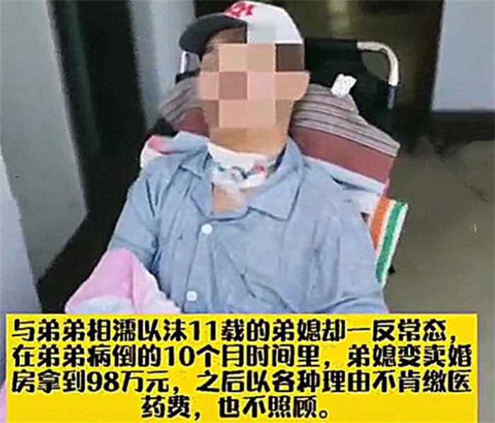 在弟弟生病之后,他的弟媳妇儿就说要把家里多余的一套房子给卖掉,先给丈夫看病,结果就把这套房子卖了98万元。可是当卖房款到账之后,他的弟媳妇就直接变卦拿着很多钱直接就跑了,到最后只是留了5万块钱的医药费。在这之后先是问他要钱他不给,随后就直接联系不上。