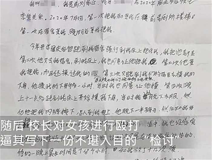 根据这个校长的说法,这个女孩儿有早恋的现象,并且还有男生出入女生宿舍,为了证明这个女孩子的清白,家人带着医院进行了妇科检查。检查的结果显示这个女孩儿清白还在,和这个检讨书有很大的不同,可以看到这个校长是凭借着自己的意思去逼迫孩子写。在检查的过程当中发现孩子浑身有多处淤青,并且有着耳鸣的现象,随后也是停课了。两个月左右,在家里什么都不愿意说,家人带着孩子去看看心理医生。