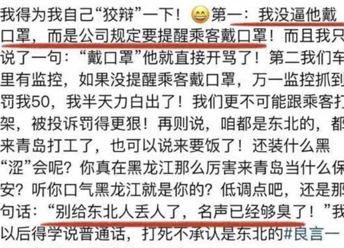 相信听到这些话之后最生气的应该就是东北人,尤其是黑龙江人。这个孩子能够把不戴口罩这样没有素质的行为如此嚣张,还展现出来的对于警察的同志的不尊重。可能是他想要在大庭广众之下给自己找面子,不过这样的行为让他更加尴尬。不过看起来这个司机的提醒,也并没有什么过激的言行,并没有伤害到这个男子的面子,只能说这个男子遇到一些小的事情就容易非常激动。这样只能让他自己看起来非常狭隘,现在他已经成为了整个网络上的小丑。