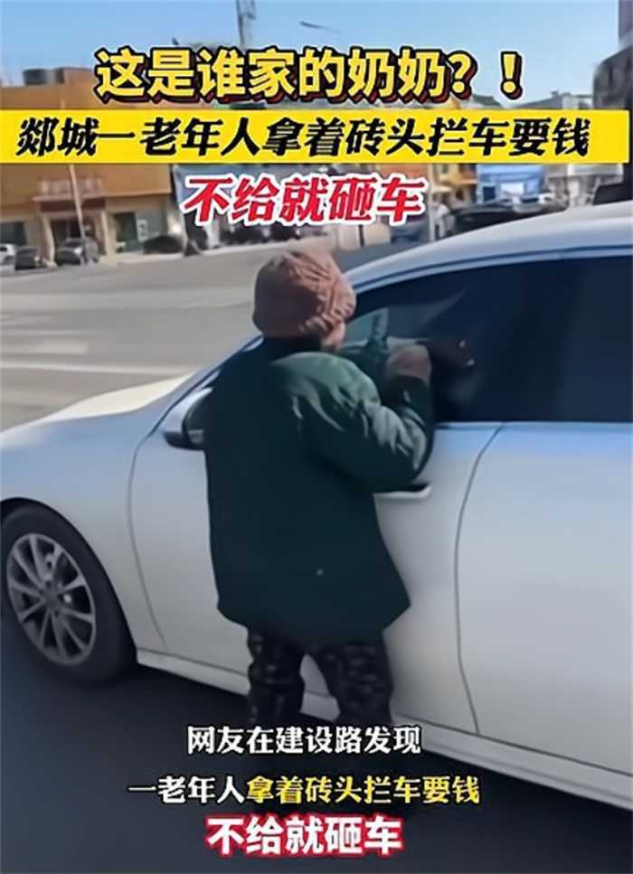 山东老人拿砖拦车 不给钱就砸车(坏人变老)