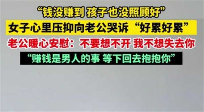 老公在知道了这位女士的心情之后,安慰说不要想不开。赚钱就是男人的事情,等下下了班回去抱抱你,可能女士看到老公这样说之后,感觉老公是能够明白他有多么困难。不过对于大多数女性来说,是不要在家当全职主妇的好。