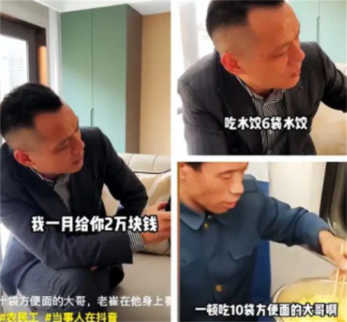 根据了解,这个吃方便面的大哥是河南人43岁,大哥说自己之前在一个物流公司上班,当时是因为自己饭量太大,所以就被老板给辞退,只能回家种地,后来也开始去当农民工,他说自己吃水饺可以吃六袋,吃馒头可以吃20个,要是吃排骨的话可以吃六斤。然后网红崔校长就发出邀请,说让这个大哥跟他一块儿干,包吃包住,还会给2万的工资。