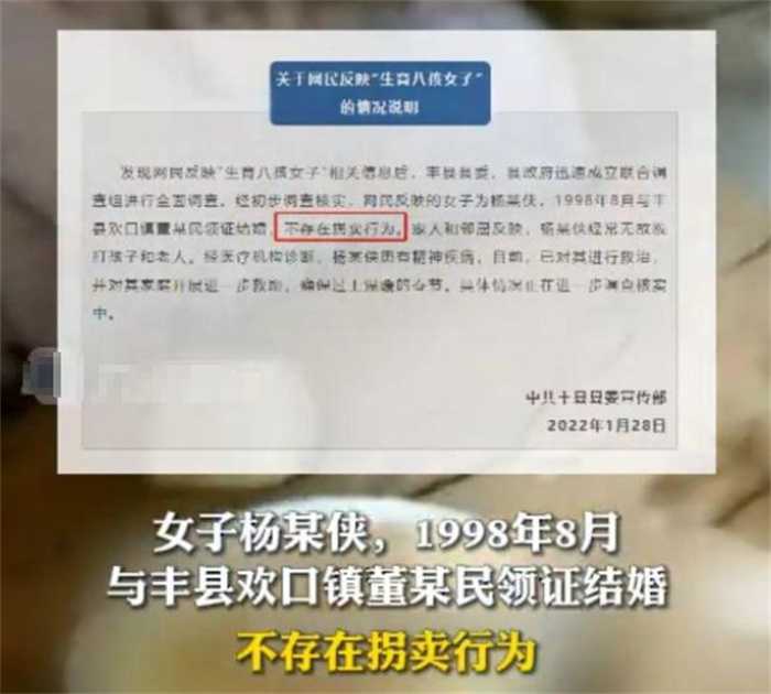 随后根据当地的相关部门表示,这个女子已经有了精神疾病。被怀疑是从外地拐卖过来的,因为口音还是外地口音,现在当地已经对于这个女人进行救治,并且对于他的家庭开始救助。至于是否是拐卖过来的,以及他的老家是哪里,还有他的家人是什么情况,后续的调查没有公布出来。不知道这个女子现在是什么样的情况,但是根据相关的证件可以表明在1998年的时候,这个女子已经和她丈夫结婚,丈夫称没有拐卖行为。
