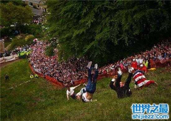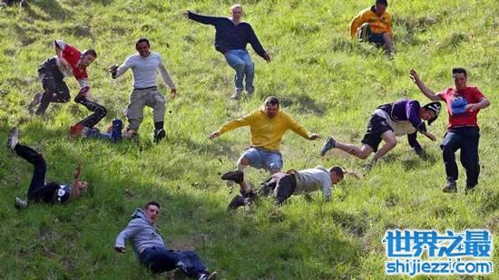 听这个名字就知道这个节日一定是非常的闹腾的,这节日非常的危险,因为人们要在陡峭的小山坡上追逐一个非常重的乳酪轴,因为这个乳酪轴非常的重,所以它滚动的速度非常的快,人们疯狂的追逐,容易发生踩踏事件,但警察阻止不了。