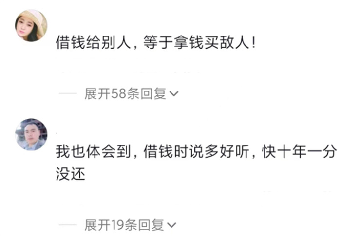 有网友说了十分经典的一句话,就是借给别人钱就是花钱买的人,当代这个社会有很多人根本不会把人情放在眼里,哪怕是再好的朋友或者亲戚借钱的时候都应该让对方打一个欠条,不要因为所谓的面子而让自己白白吃亏。