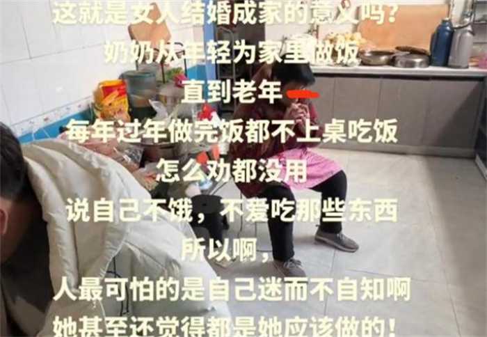 一些老人的穷苦思想一辈子都无法改变。在每年到了过年的时候吃年夜饭,大家都会一家人在一起吃,但是有的老人则是会成为例外,比如说在日前山东的一个家庭就出现了这样的事情。一个奶奶在做完年夜饭之后,自己却在旁边儿吃馒头,自己不愿意上桌。