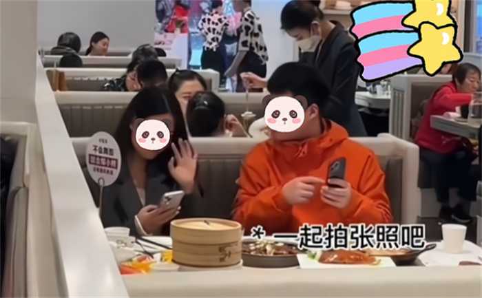 在河南的一个餐厅里面可以看到一对情侣在吃饭,可是在刚上菜之后,男生却不敢动筷子。女生让男生先站到一边,让女生拍完照之后,男生才能坐下吃,随后男生想要和自己女朋友拍个合照。