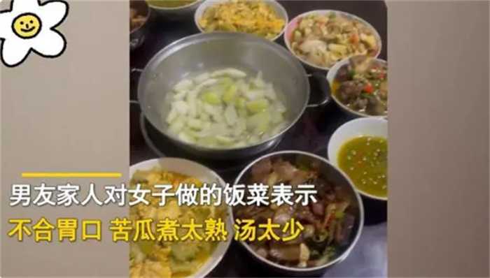根据这个女孩儿所说,她到了自己男朋友家里的时候,男朋友和他的父亲正在装修他们的新房子,还说这是给他们两个人准备的婚房,女孩儿就进入厨房给他们一家人准备饭菜。准备接受一家人的夸赞,但是没有想到在吃饭的时候接下人,没有夸赞女子,还被男方的父母嫌弃女孩儿做饭做得不好。女孩子感觉自己非常伤心,自己第一天来不但没有受到客人的待遇,反而自己辛辛苦苦做出来的饭菜还要被别人嫌弃,连自己深爱的男朋友都没有帮自己说话。
