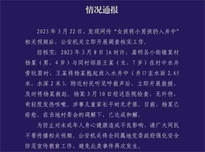 小男孩儿被年龄稍大的女孩儿扔到了井里,家长说小孩子不懂事。在前段时间可能大家都看到这么一个新闻,一个女孩儿抱着一个男孩儿直接丢进了一个井里面,可以看到女孩儿要比男孩儿稍微大一些,但是女孩儿年龄也不大,最多是上一二年级。这是惊呆了很多的网友,这个女孩儿明明年龄这么小,为什么这么恶毒?