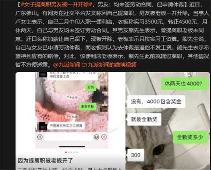 女子向公司提出离职之后,公司把她的男朋友也开除。在日前,广东佛山的一个女子向公司提出了离职。可就是因为这次离职,导致这个女子的男朋友也被公司开除,根据当事人所说,他和自己的男朋友,根据当事人卢女士所说,自己在二月中也就是一个多月之前入职的一个便利店,老板说在实习期,每月工资3500,转正之后就是4500元。