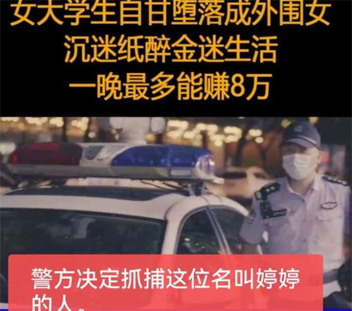女大学生自愿成为外围女一晚上就可以赚8万元。现在我国对于黄赌毒抓的是十分的严厉,不过还是会有一些女性自愿去卖淫,而他们还有这一个比较官方的名字叫做外围女,这些女性都是自甘堕落的,愿意出卖自己的身体去换取金钱。在日前一个小区外面便衣警察们就坐在车上确认了抓捕对象之后进行了抓捕,最后抓捕到一个嫖客以及一个外围女。但是没有想到这个外围女居然是一个刚刚毕业还没有几年的年轻女孩。
