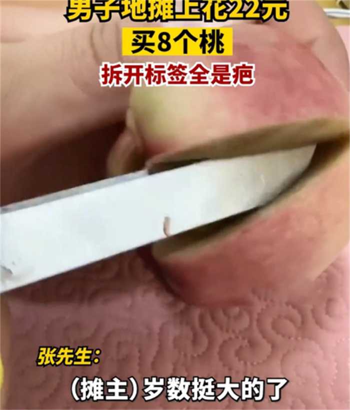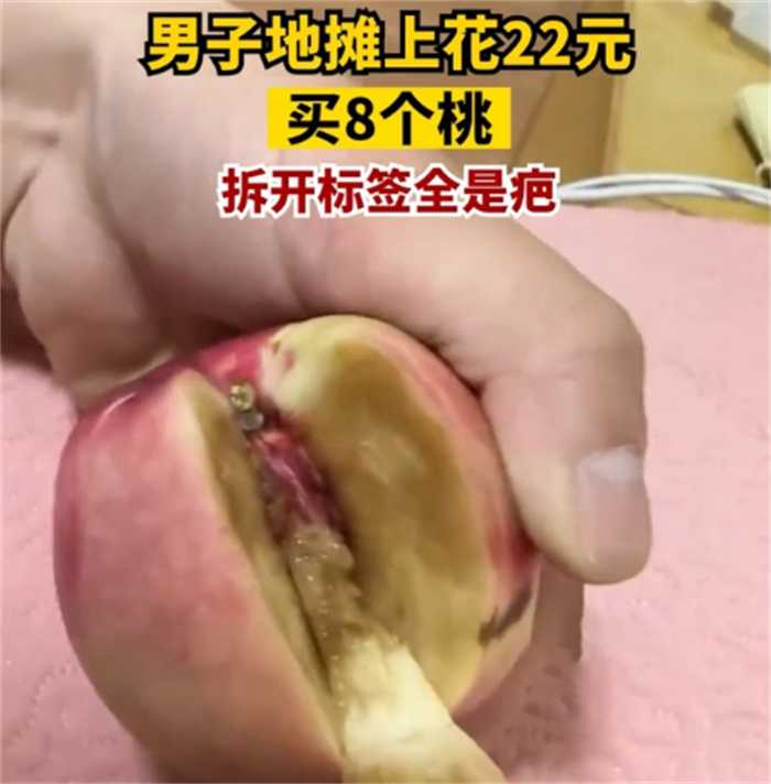 广东广州有一个小伙子下班的时候发现路边有卖桃子的感觉。还挺鲜艳,就上去看了看,最后这个小伙子花了22元买了八个桃子,价格并不算贵,可是他准备品尝的时候却直接傻眼了,因为他揭开商标之后发现商标下面全都是黑点,也就是说这些桃子其实并不是很好,甚至这个小伙子都不敢下口吃。