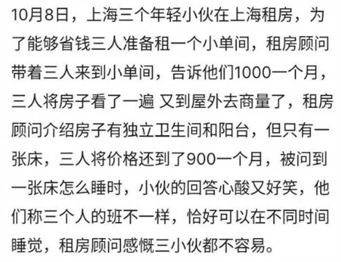 三个男子租房只有一张床,他们需要轮流睡觉。现在的年轻人想要去大城市打拼是十分的困难,尤其是在北京和上海这样的大城市,想要租一套好的房子可能需要很多钱,但并不是所有年轻人都有钱去租房子,在去年就有三个小伙子来到上海之后,合租了一个房子,最让人惊讶的则是这个房间里面只有一张小床,只能够涉及到一个人。