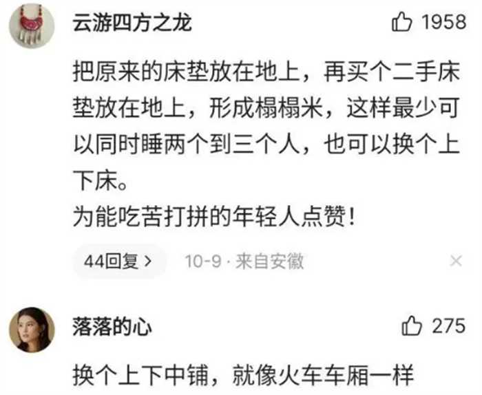 中介就把这件事情给上传到了,网络上不少的网友都在夸赞三个小伙子能够吃苦耐劳,虽然这几个年轻人们现在日子过得非常艰苦,相信他们在一年之后或者两年之后都可以有自己的房间,甚至在若干年后都可以在上海买房子,能够吃苦耐劳的人会更加有前途。当然,这也看得出来,年轻人们想要在大城市打拼绝对不是一件容易的事情,光是房租就已经压倒了不少人。