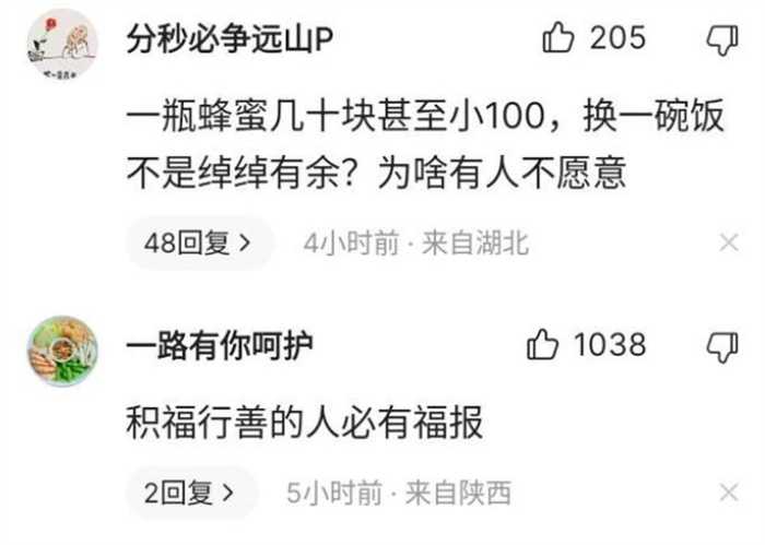 这之后老板的善举就被周围的人逐渐知道,很多人都对于老板的行为点赞,觉得这是一个好人,纷纷去他的店里照顾生意,不过也有些网友说这个老大爷也是有自尊的,老大爷既然提出了可以用蜂蜜来换,就代表着老大爷不想不劳而获,其实男子完全可以收老大爷一些蜂蜜,然后给老大爷多一些的饭,这样不光可以有善举,更加可以照顾老大爷的情绪。