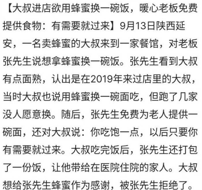 在去年陕西的延安市就发生了这样一件事情,一个卖蜂蜜的老大爷,因为没有钱吃饭,但是肚子很饿,所以就找到一家面馆起初可以用蜂蜜来换一份饭来吃,老板可能也是知道这个老大爷是实在没有办法才会提出这样的请求,老板也是说不要蜂蜜,直接给了他一碗面,还多加了不少的料,随后聊天的时候,这个大爷说自己的家人正在住院,因为需要花钱治病,所以自己连吃饭的钱都没有,老板又做了一份饭,让他带给了自己的家人。