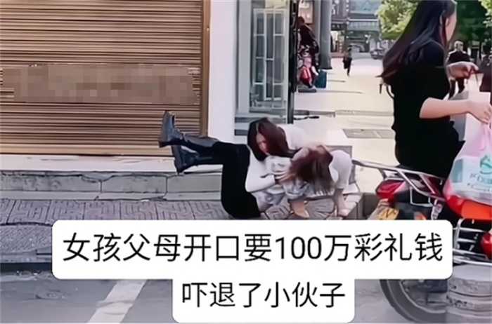 去年春天就有一个网友上传视频,一个小女孩儿在路边哭泣,旁边儿的母亲想要扶起她,是因为两个人刚刚见过父母,女方父母给男孩子提出的要求是要100万彩礼。这一下直接把男孩儿给吓跑了,因为男孩儿家庭条件虽然不错,但是100万彩礼是肯定掏不出来的。在男朋友跑了之后,他们两个人的感情可能也会分手,这也导致了女孩儿在路边哭泣。