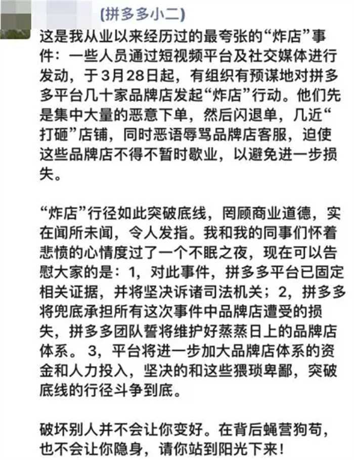 拼多多的几十家品牌店遭遇到网络炸店不得不歇业。在3月29日可能很多关注电商的人都看到了这么一张图,就是拼多多的小二朋友圈儿的截图。拼多多这个平台上有几十家的品牌旗舰店,突然就遭遇到了很多身份不明的网友进行炸店,而这些品牌店为了自身的收益以及自身的名誉只能暂时的歇业,避免造成下一步的损失,但是这样的行为依然是有很大影响。