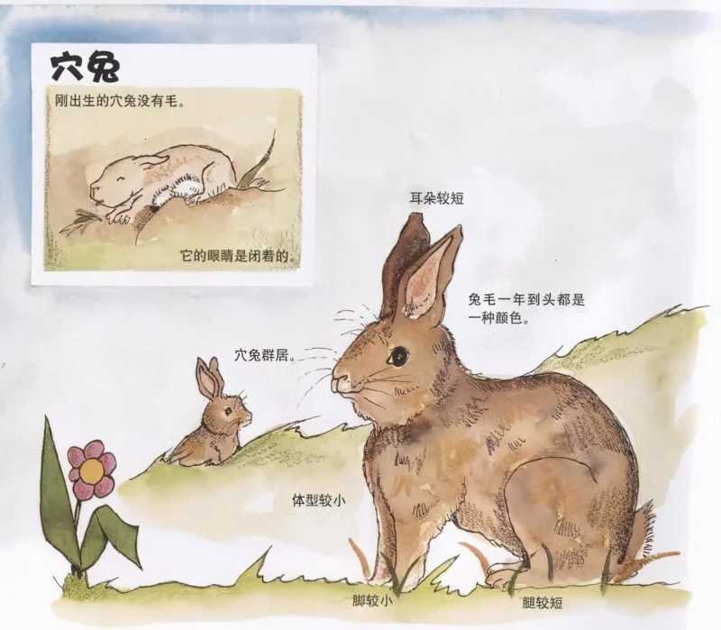 穴兔是家兔的祖先。有意思的是,区分穴兔与野兔的最显著特征是,前者挖洞,后者不挖洞。比如穴兔体型小,善挖洞穴,生产幼仔;野兔体型大,细长,兔爪长,耳朵尖端为黑色,眼睛明亮,独居,不挖洞。