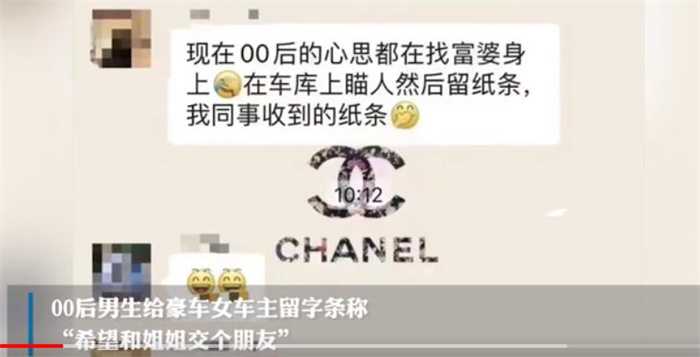 在网友爆料的视频中,这名女子手里拿着一张小纸条,上面写着,你好姐姐打扰了以这种方式和你联系,希望姐姐不要怪我,只是想和姐姐单纯的认识一下,交个朋友我是一名00后的男孩身高1米8,如果愿意和我交朋友的话,可以加弟弟的联系方式,在末端还留了他的电话号码,包括一个心型的图案,这种搭讪的方式屡见不鲜。而小伙的司马昭之心网友也看得非常明白。这一名年轻的小伙为什么要在车上去留纸条呢?目的很简单该名女车主驾驶的车辆是一台保时捷91 1,该车的价格因为车身的配置不同价格是从100多万到200多万不等,之所以留这个纸条是因为他留意了驾驶该车的是一位女性,想要通过找富家子女的方式去改变自己的命运。