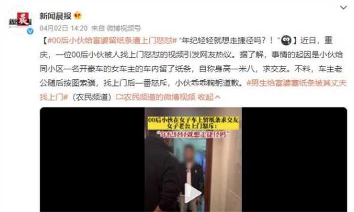 近日关于#一名00户小伙儿给富婆塞纸条,遭对方老公上门怒怼#的视频迅速火遍了全网。事情的起因是这名00后的小伙在自己的小区碰到了一位开豪车的女车主,随即在女车主的车里面留了一张纸条,纸条上表是自己身高1米8,求交友,没想到的是车主的老公按图索骥,竟然找到了小伙随后展开了一番怒斥,小伙也意识到自己行为的冲动,鞠躬道歉。