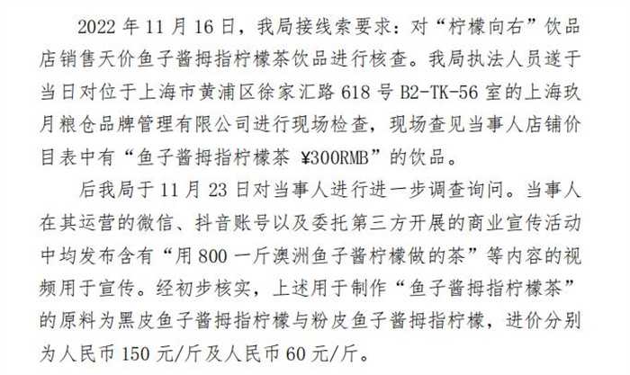 在该则处罚详情中,明确显示出黄浦区市场监督管理局在接到群众线索举报之后,对柠檬向右该家饮品店所正在出售的天价鱼子酱拇指柠檬茶饮品进行了检查,冬天前往现场进行执法的工作人员,发现店铺价目表中的鱼子酱拇指奶茶标价为300人民币,当事人在为店铺中的该种奶茶进行宣传活动时发布了一条内容声称,这种饮品用800一斤,澳洲鱼子酱柠檬茶制作而成等各种内容,调查之后发现柠檬奶茶的主要原料分别为黑皮子酱拇指柠檬以及粉皮,鱼子酱,拇指柠檬等,三种商品的进货价格分别为150元每斤以及60元每斤,这种制作饮品原材料的柠檬,价格要比宣传价格的800元一斤低了很多,因此当事人所使用的宣传标语,写出的内容明显和实际的进货价格出现了极度不符的情况。