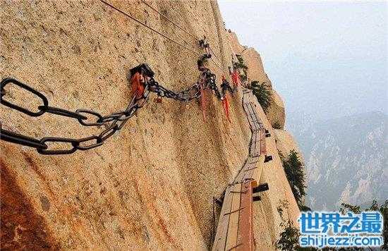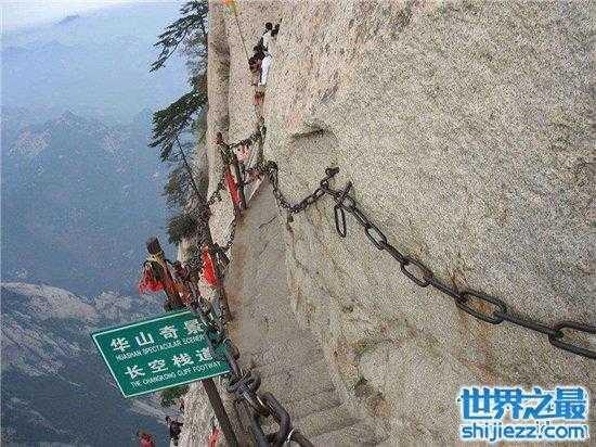 世界最恐怖的三条栈道的第一条就是在华山的长空栈道,这个长空栈道据说是以前在华山学派的一个大师为了出世,只用一了些石头和链子就打造出来的,看起来非常不安全,但是整个长空栈道却是贯穿了从华山的最南部到最东侧的,已经是一条很长的栈道了。