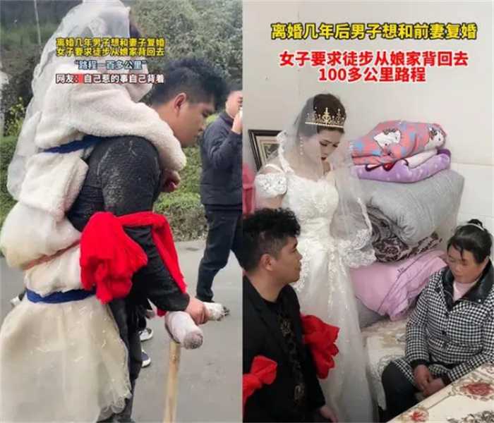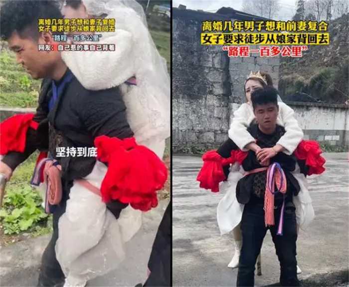 据说这个男子和自己的前妻已经离婚三年了,在前段时间这个男子就说要和自己的前妻复婚,前妻也答应了,不过提出了一个条件,就是让男子徒步背着自己回家,要知道从女子家到男子家有着100km,而男子为了自己后半辈子的幸福也只能答应了自己前妻的要求。网友们都在说这个前妻非常的聪明。只有这样在回家之后,男人才不敢随随便便的欺负人。让女人在家里的地位变得更高一些,而这个男人可能也是知道妻子还是原配的好,所以哪怕是咬着牙也要把前妻再娶回家。