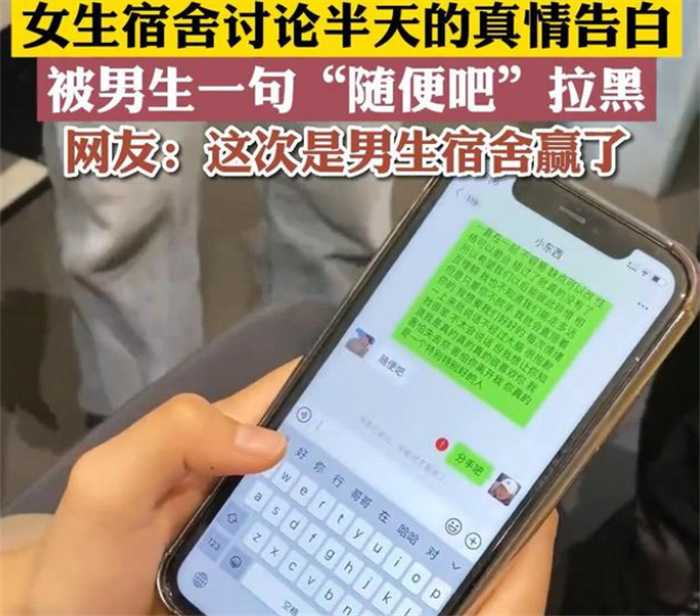 山东一个大学的女生就记录出来说自己的室友和男朋友闹了一些矛盾,而女生想了半天,决定和男朋友复合,写了一段小作文发给了男朋友,期待男朋友能够给她一些温暖的话语,但是男朋友很快就回复的三个字随便吧,很显然男子都没有把这个小作文给看完。这一下子就让同宿舍的几个女孩子们开始讨论。
