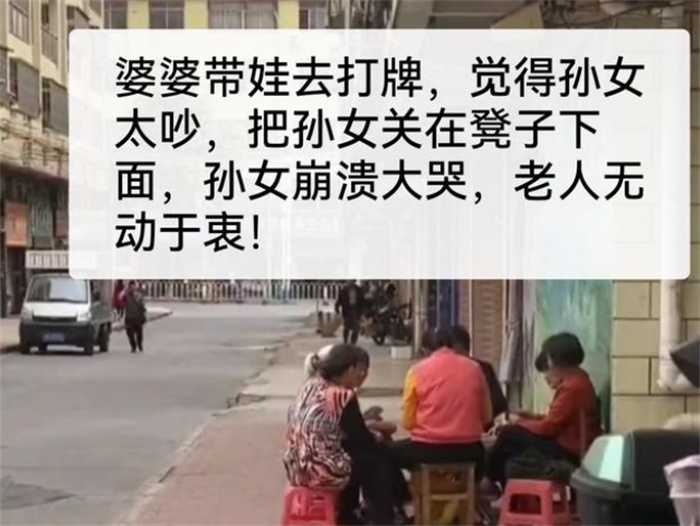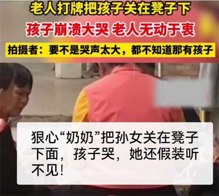 在日前广东一个老人在和自己的好朋友打牌的时候,为了防止孩子随便乱动,导致她打牌,直接就把孩子扣在了百分之下,让孩子根本动弹不得,孩子也在下面哇哇大哭,导致很多路过的人都在看这个孩子,要不是他们听到孩子哭声,可能根本不知道孩子居然被关在了板凳之下。这个老人如此照顾孩子,很显然是一种不负责任的行为而面对自己孩子的苦恼,这个老人根本不为所动。