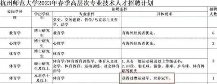 而杭州师范大学的招聘体育老师的条件也引发了网友的重大关注,上游新闻记者在4月7号的时候也在该学校的官网上看到了这一条招聘启事。记者发现在这一次招聘启事中一共招聘4名教师,岗位类型分别是教学科研岗位,其中有两个教师岗位要求的是硕士及研究生以上的学历,只有一个岗位是要求本科学历及以上。其中有一个岗位要求获得过世界冠军,以及奥运冠军,