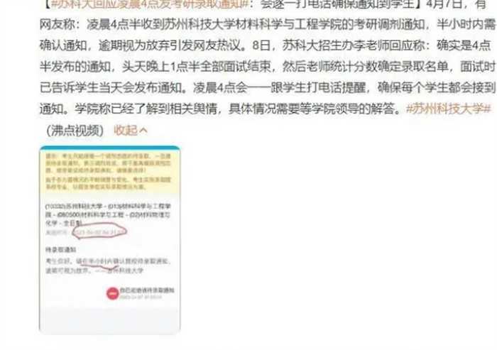 苏科大的招生办老师回应说,他们确实是4:30左右发的通知,而在前一天晚上的1:30已经全部面试结束了。在凌晨4:00会跟学生们打电话做提醒,确保每一个学生都可以接到通知。至于为啥只给了半个小时,学校的老师表示今年想要调剂的学生比较多,一共选择了200名学生来参加面试,这个人数特别的多,要是学生真的愿意来的话,那半个小时也已经足够了。可即便是这么说,也是遭遇到了网友们的广泛不符。