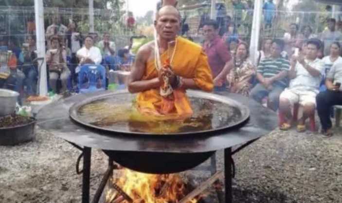 泰国高僧坐在翻滚的油锅里表演,淡定自若,却被观众当场拆穿