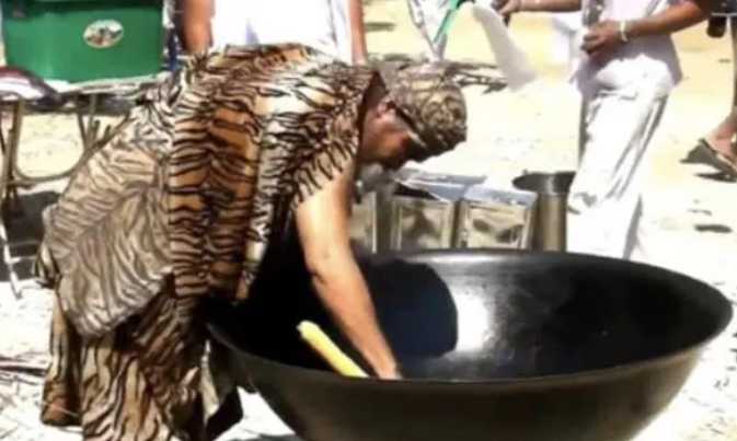 在锅中打坐的高僧,神情坦然自若,我们可以看到锅内正在翻滚冒泡,铁锅下面还有一堆正在燃烧的火柴进行加热,大家应该都有在炒菜的时候被热油不小心的烫到过吧?被烫到可是非常的疼,甚至被烫出水泡。而有的网友看到这段视频就说这位高僧是不是有特异功能啊?在场的观众看到这一表演也觉得非常神奇,纷纷都感慨泰国这位高僧真的神了,可这样神奇的表演就让当场围观的一个群众给拆穿了。