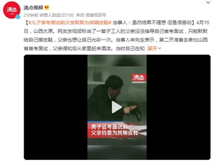 据当事人申先生表示,原来第2天自己准备去参加山西省省考面试,父亲在知道自己的消息之后,立刻从家里赶到酒店来见自己,然而当时自己正在和堂姐打电话,询问参加面试时需要注意的一些事项,在抬头的瞬间就看到了父亲,正在蹲在那里给自己擦皮鞋,看到之后自己非常的感动,申先生也表示虽然面试的结果并不是特别的理想,但是在路上父亲却一直安慰着自己。
