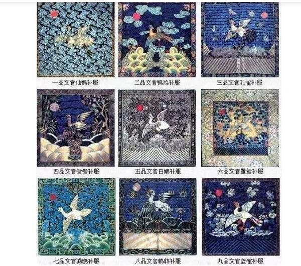 清朝文官用的是禽鸟图案,代表儒雅贤德。武官,以猛兽为官服图案,代表勇武彪悍。清朝(文官)一品:仙鹤。仙鹤美丽,高雅圣洁而且长寿,在古代吉祥鸟中其地位仅次于凤凰。《诗经·小雅》云:“鹤鸣九皋,声闻于天”。官员的补之一品采用仙鹤的图案,取其奏对天子之意。清朝(武官)一品:麒麟。麒麟在古代传说中是神兽。麒麟为官服一品武官的形象,象征着“武备而不为害的”的王道人君形象。清朝(文)二品: 锦鸡,也称金鸡,玉鸡是吉祥的象征。代表威仪和显贵。清朝(武官)二品:狻猊,像狮子的一种神兽,可伏虎豹。传说是龙王的儿子,好烟火,故立于香炉之上。能伏虎豹,当然是取其勇猛之意。清朝(文官)三品:孔雀,不仅美丽,而且有品性。《增益经》从孔雀有“九德”……孔雀在古人眼里,是吉祥,文明、富贵、象征。清朝(武官)三品,豹,《说文》的解释:“豹,似虎圆文”。意是取其勇猛之意。清朝(文官)四品,云雁。 《仪礼·士相见礼》规定:“下大夫相见以雁”,也指官吏的排班。象征飞行有序,舂去秋来佐天子四时之序。清朝(武官)虎,《说文》曰:“山兽之君,以喻威猛。”《宋书·符瑞志》白虎。王者不暴虐,则白虎仁,不害物。所以,老虎为百兽之王,有王者的智慧具有“仁,智、信”之范,所以颇受将帅崇拜。